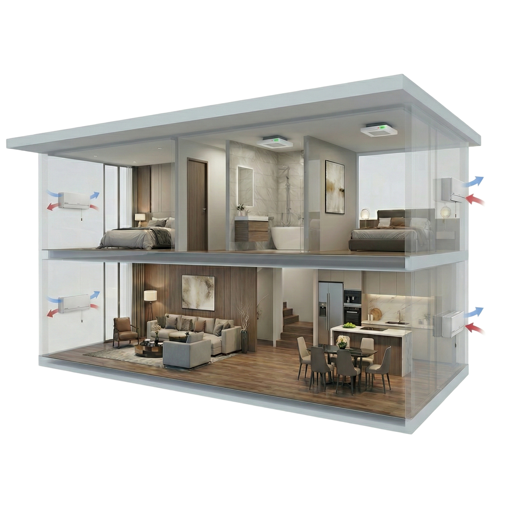 Recyrkulacja powietrza z odzyskiem ciepła do 90%. Świeże powietrze zimą bez wychładzania, latem — przyjemny chłód bez klimatyzacji w każdym pomieszczeniu.